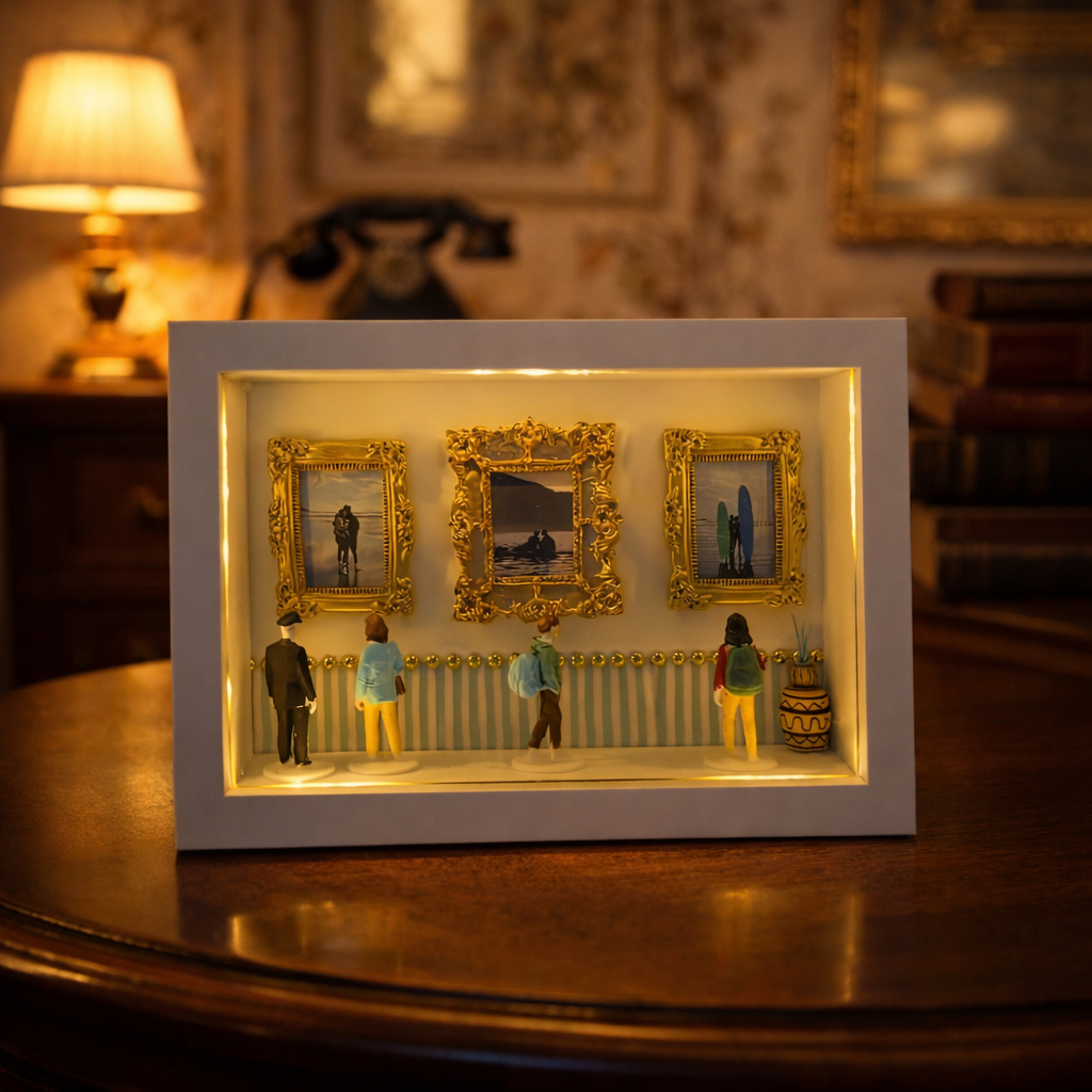 • LED aydınlatmalı müze konseptli ana çerçeve • 3 adet altın detaylı mini fotoğraf çerçevesi • 4 adet hazır boyalı 3D insan figürü • Dekoratif arka duvar kaplaması (duvar deseni) • Altın renkli dekoratif şerit ve aksesuar parçaları • Kurulum için gerekli tüm bağlantı ve yardımcı parçalar
